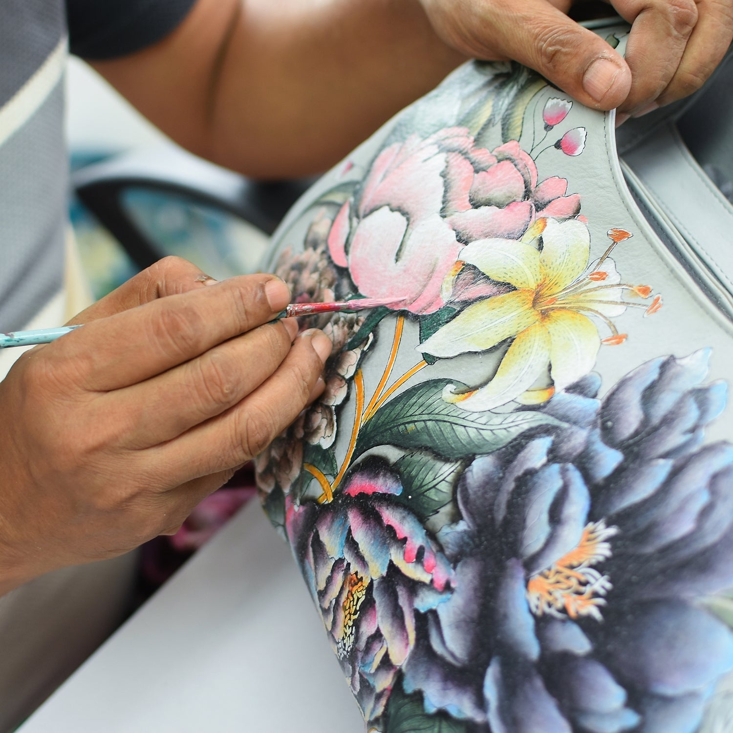 Given the delicate nature of the painting, we do not recommend using any chemicals to treat stains on the painted surface. You can lightly pat with a soft damp cloth, never rub the hand-painted surface.